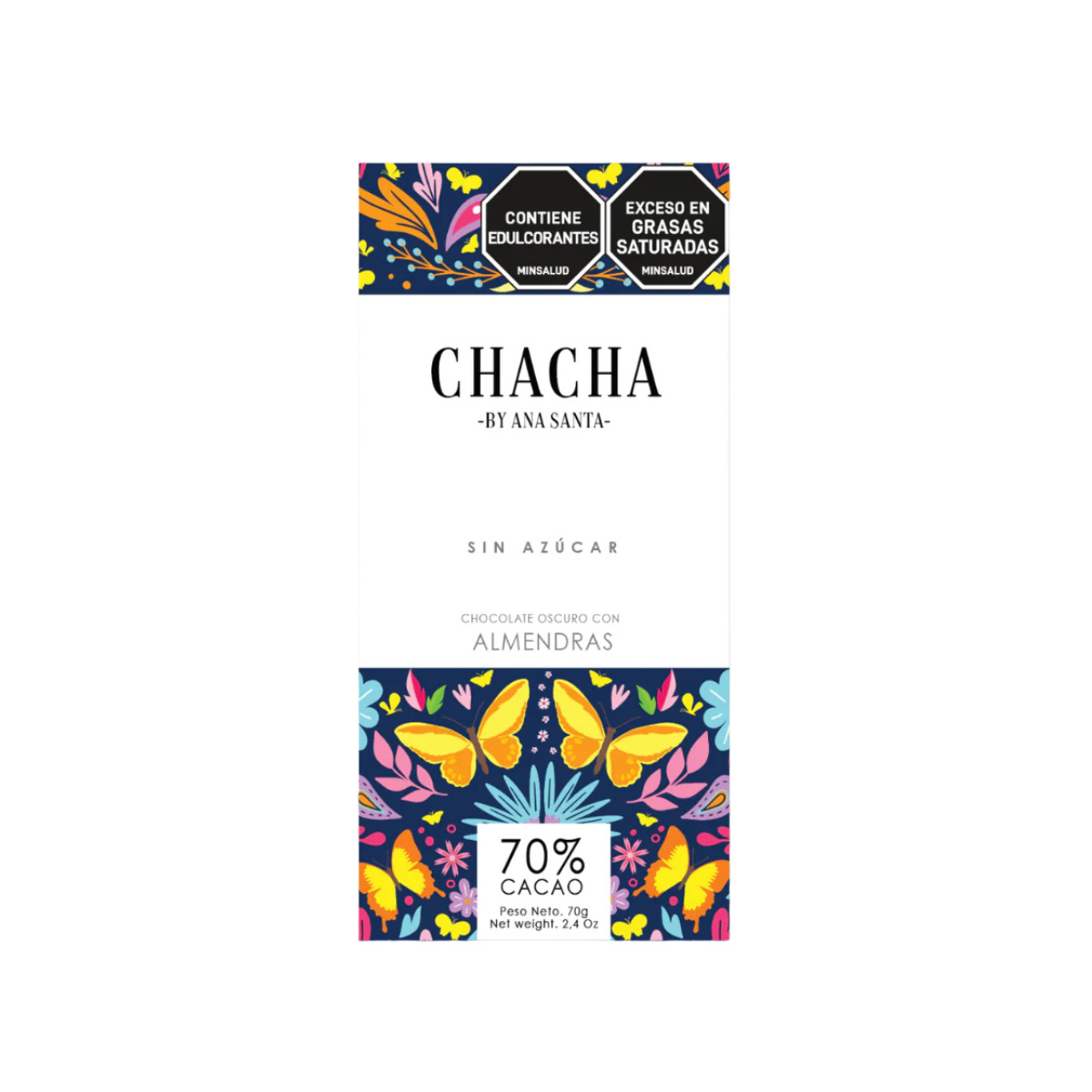 Chacha Chocolate Oscuro Con Almendras 70% 70 gr es un delicioso chocolate artesanal con cacao de fino aroma al 70%. Contiene además trozos de almendras y está endulzado con stevia.