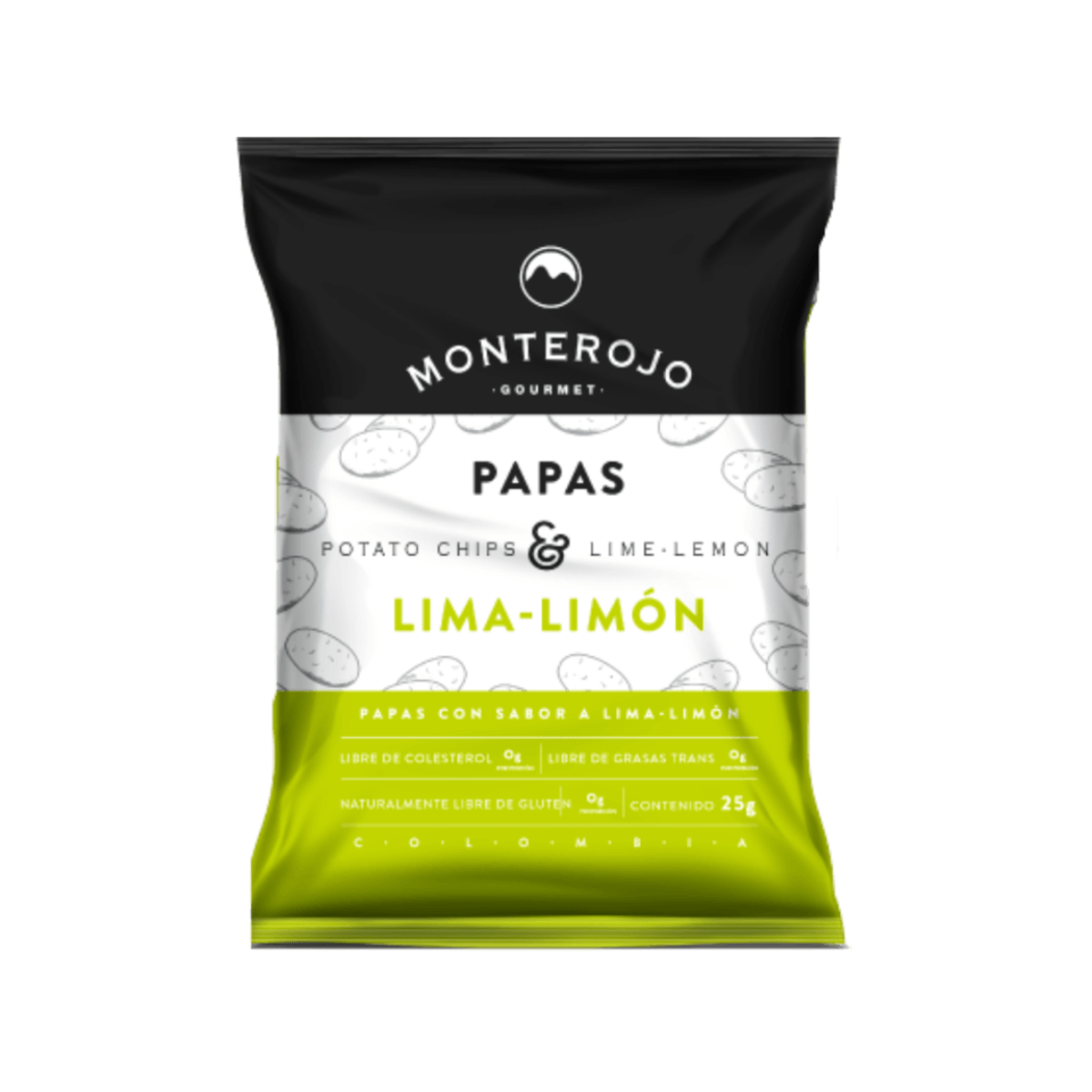 MonteRojo Papas Lima Limón 25 gr son unos exquisitos snacks de chips de papas crocantes, gruesas y rústicas con un sabor único de lima limón. Contiene papa, aceite vegetal, sabor natural a lima, sabor natural a limón, sabor artificial a limón y sal.
